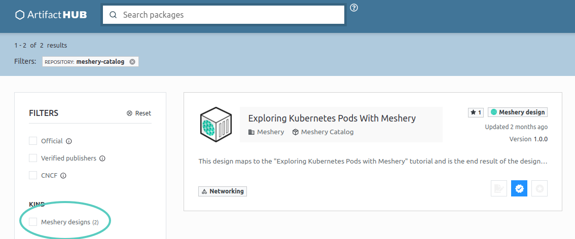 As a proud contributor to the Meshery project, I’m thrilled to announce that Artifact Hub has officially recognized Meshery Designs as a native artifact kind. šŸŽ‰ Meshery Designs allow you to create, manage, and deploy complex architectures seamlessly, which make them a great addition to the growing collection of Artifact Hub artifacts such as Helm charts, Argo templates, and many more.